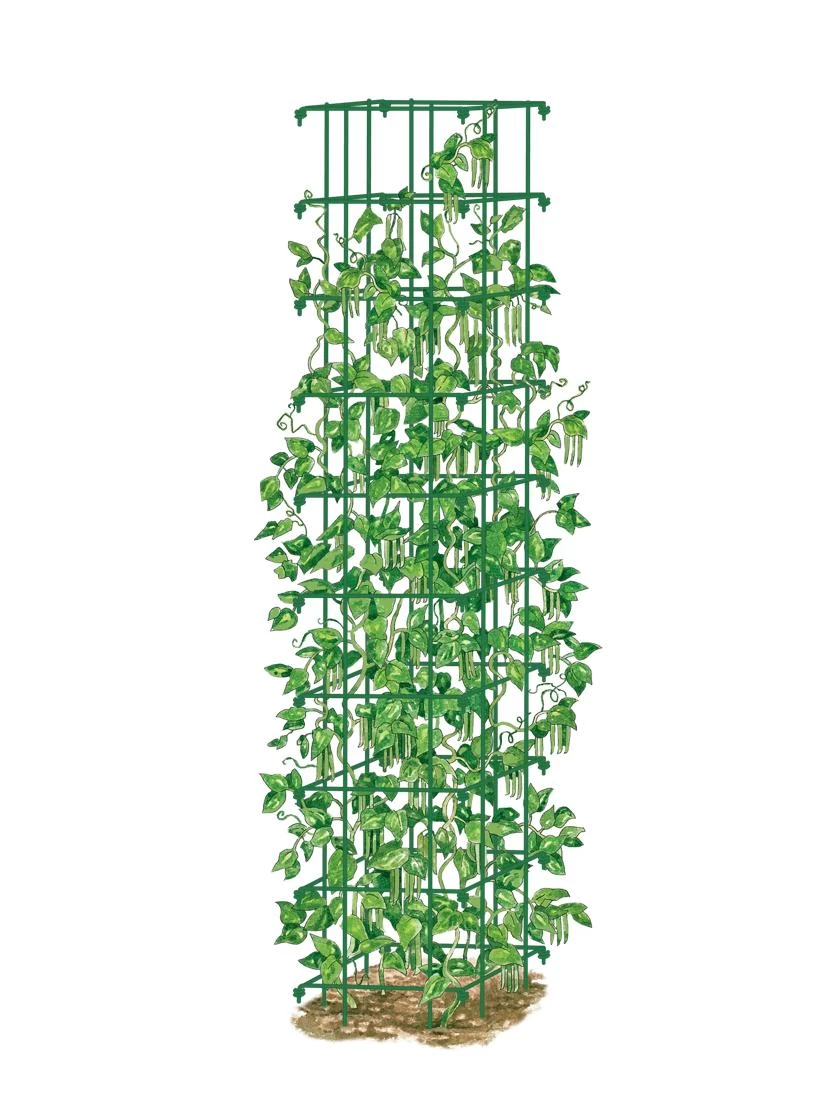Grow an incredible amount of beans with our tallest, strongest and sturdiest bean trellis tower. The secret is thicker supports coupled with 10″ legs that hold the structure securely in the ground. The Bean Tower in our test garden yielded a fantastic harvest between mid-July and late September — in just 1-1/2 square feet! Supports are 5 mm thick with 3.5 mm crosspieces. Openings are 7-1/2″ square to allow easy harvesting. In windy locations, we recommend anchoring with our Extra-Tall Earth Staples, sold separately.