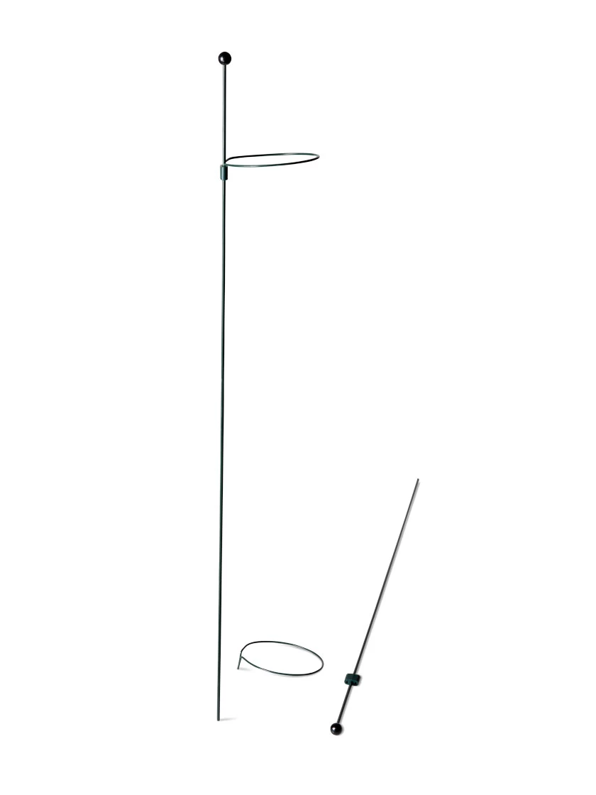 Designed to last a lifetime, these superior plant rings are simple, attractive, and ultra versatile. Unique system allows rings to slide easily up the stake to keep pace with your growing plant — and yet won’t slip down under bloom weight. Galvanized steel has a protective vinyl coat that’s gentle on stems. And a glossy finial atop the stake keeps human eyes safe from inadvertent pokes.
